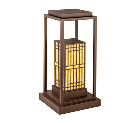 方柱鏤空矮柱柱頭燈屬于園林庭院景觀造景類裝飾景觀燈,主要以方框造型內搭配方形割花樓透光效果,燈體采用非標定制生產主要材料包含有金屬五金件、仿云石燈罩、內置燈座和LED光源,矮柱柱頭燈可根據實際安裝場所的柱子或場地定制設計不同比例大小的尺寸,(QDZTD-016)園林庭院咖啡金云石矮柱柱頭燈可安裝于庭院矮柱、園林水景旁、園林草坪中、園林入口兩側等等。